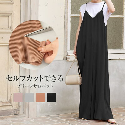 セルフカットできるプリーツサロペット [E2842] レディース リラックス らくちん ゆったり サテン 大人 夏 小柄 オールインワン サロペット オーバーオール パンツ きれいめ ワイドパンツ プリーツ キャミソールワンピース キャミ 黒