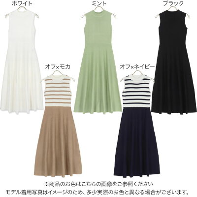 フィットアンドフレアノースリニットワンピース [E2814]【入荷済】 レディース ワンピース ノースリーブ ボーダー 大人 涼しげ 春 きれいめ 夏 ロングワンピース おしゃれ カジュアル サマー サマーニット ミモレ丈 ニットワンピース 白 黒